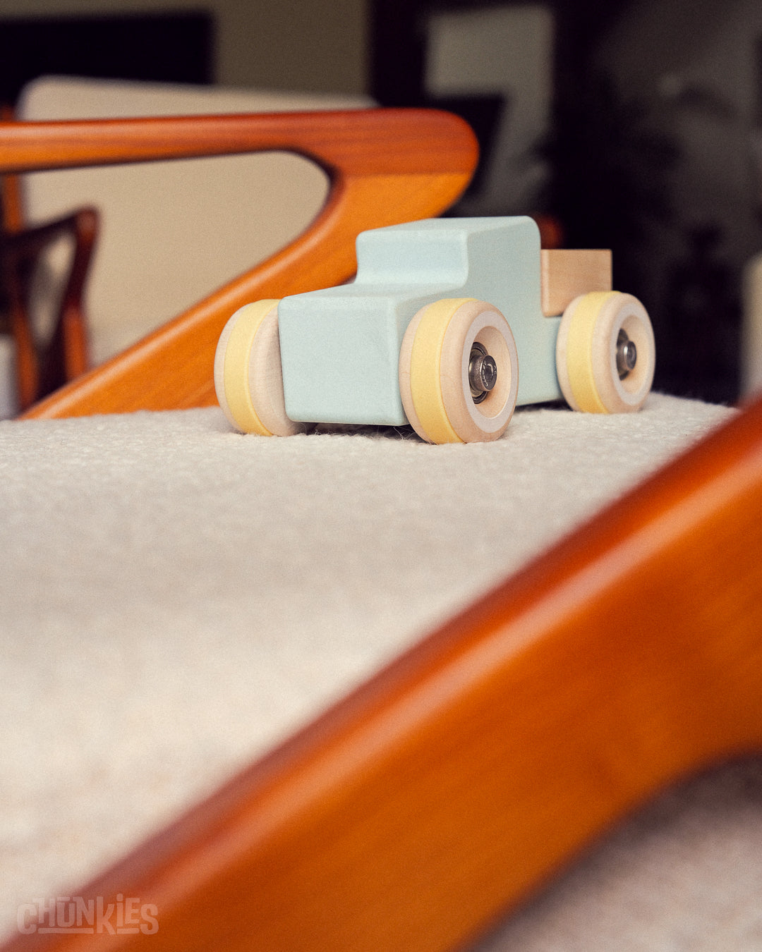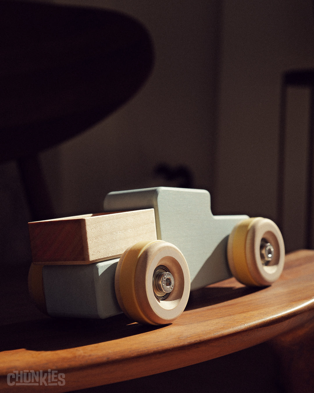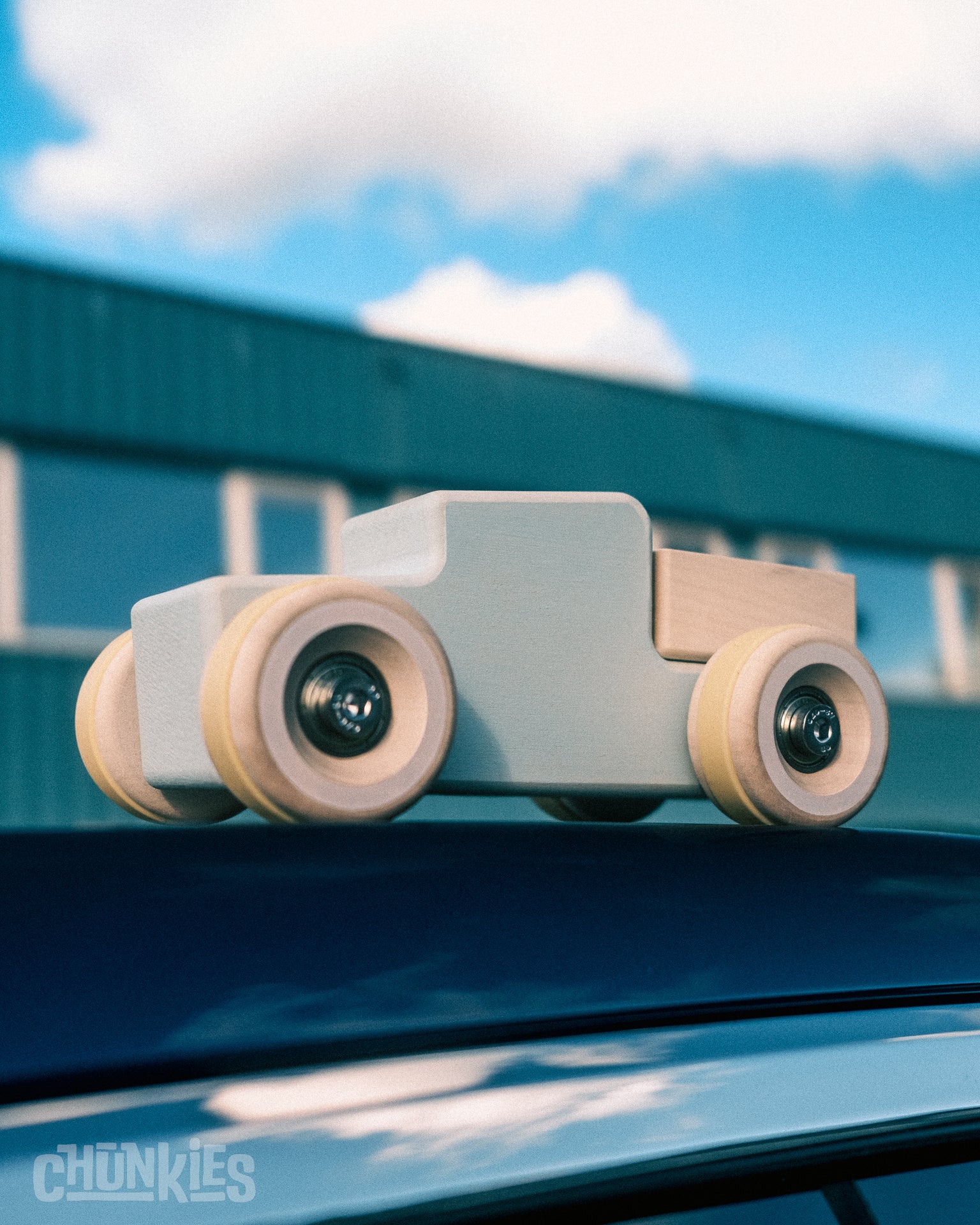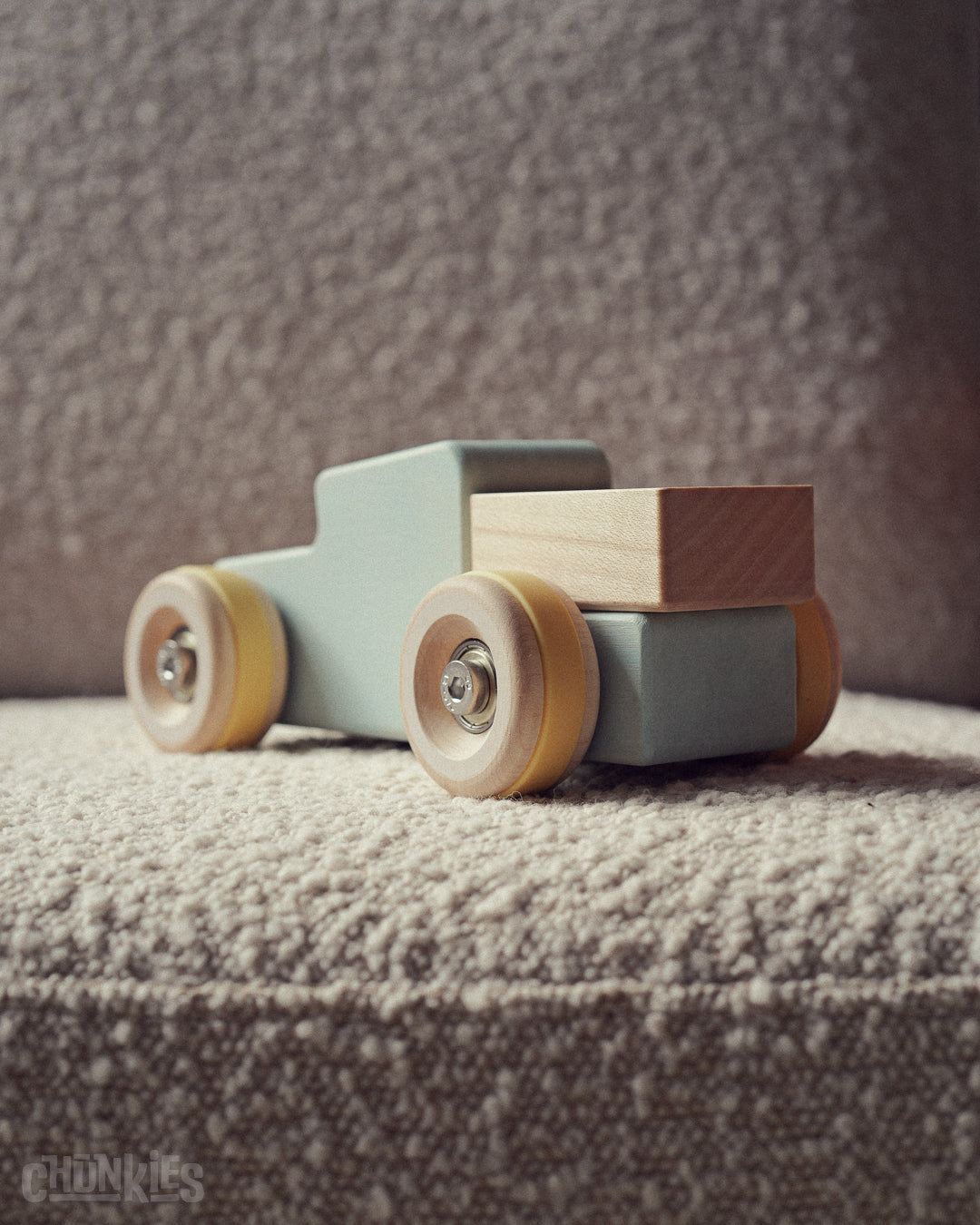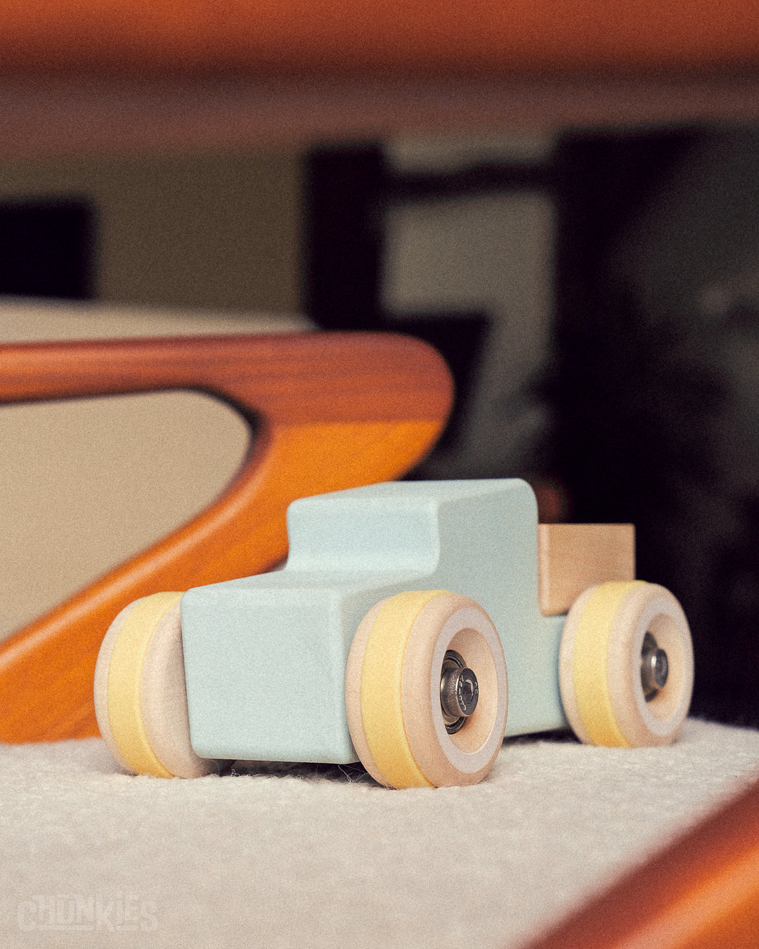 Chunkies are solid wooden toy cars with the silhouette of classic cars. They are built to last and designed to roll smoothly with real steel axles and skate bearings. Perfect for pushing, imaginative play, and collecting. There are no fixed rules – all forms of play are encouraged! Let your creativity lead the way and invent your own adventures.