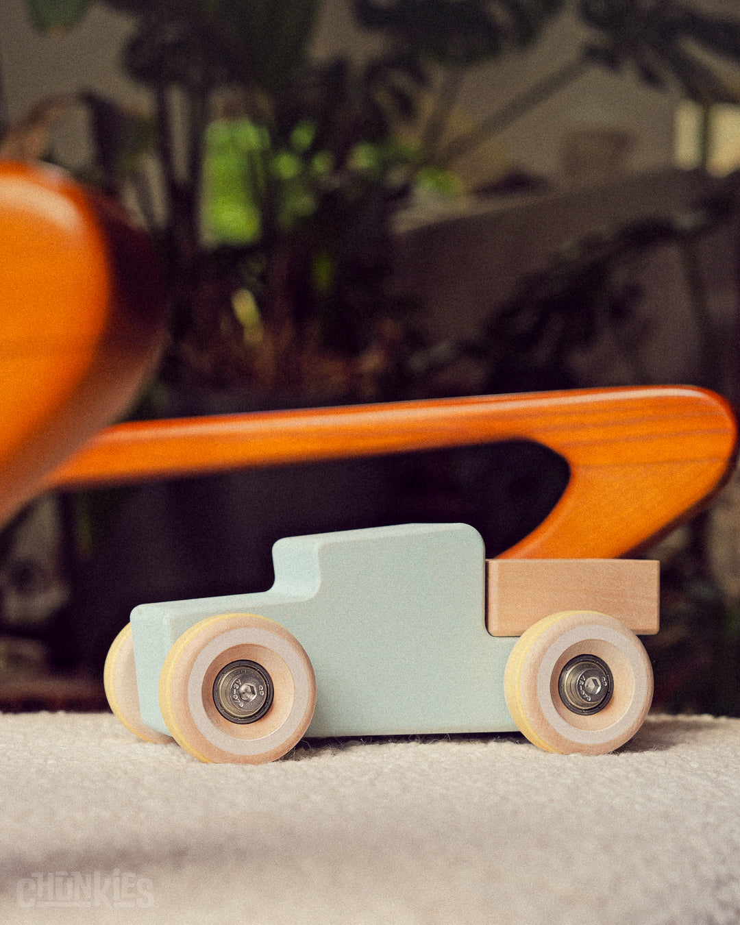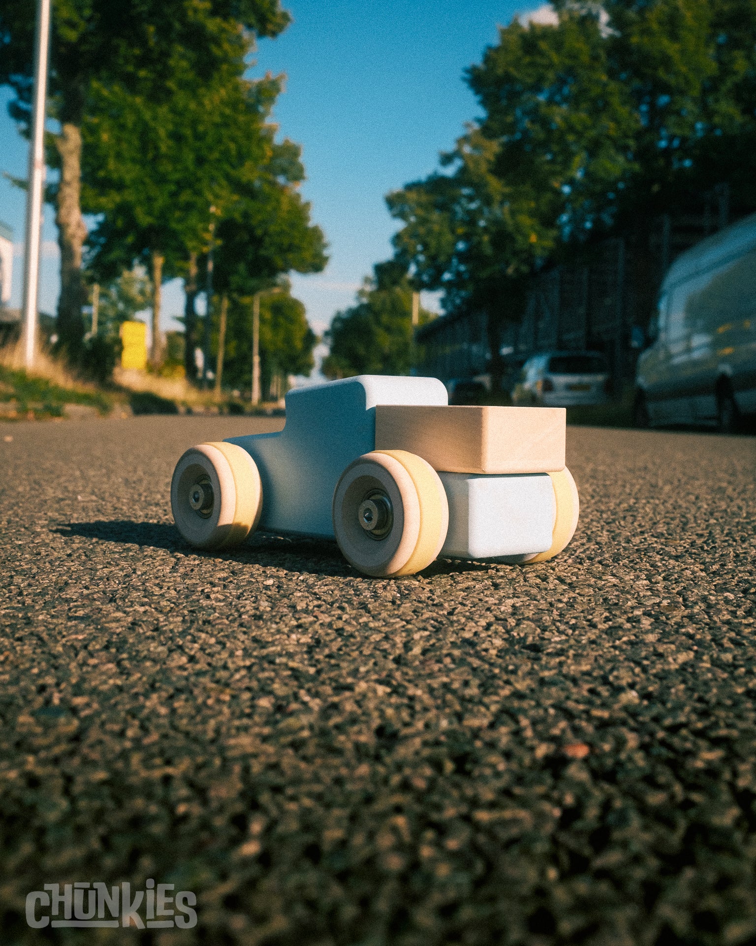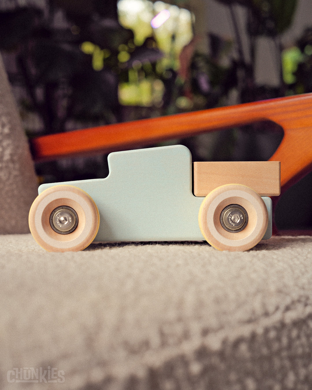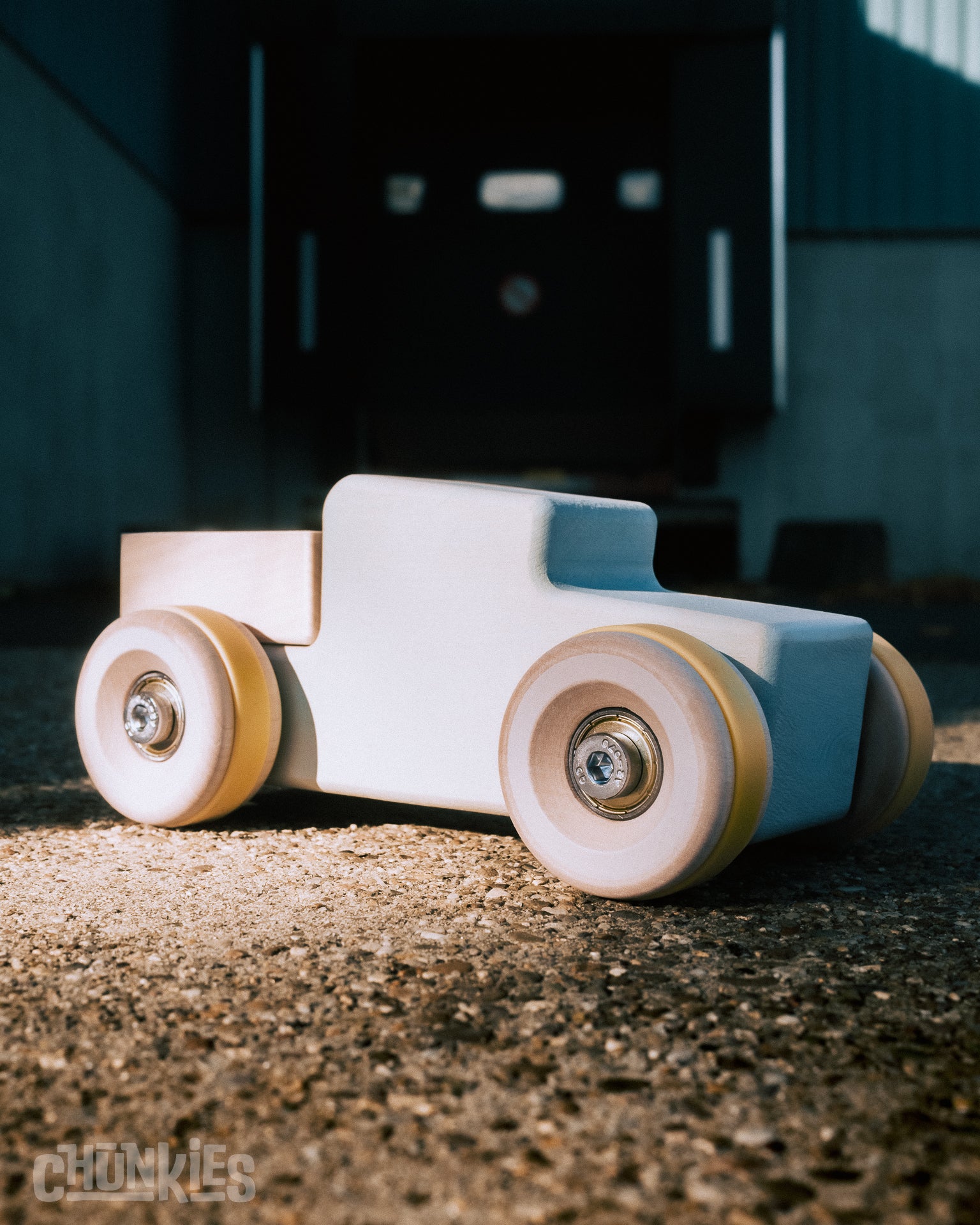 Chunkies are solid wooden toy cars with the silhouette of classic cars. They are built to last and designed to roll smoothly with real steel axles and skate bearings. Perfect for pushing, imaginative play, and collecting. There are no fixed rules – all forms of play are encouraged! Let your creativity lead the way and invent your own adventures.