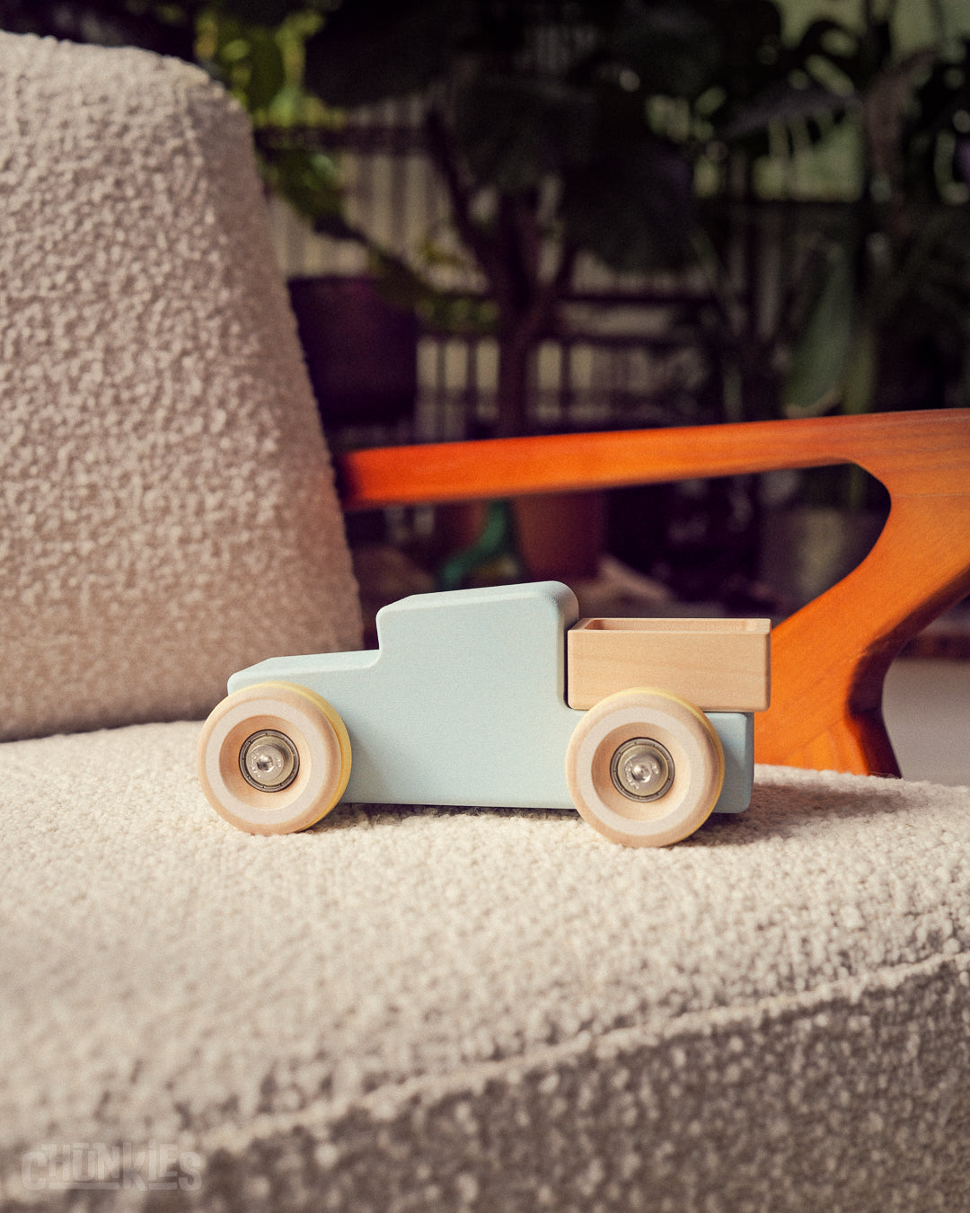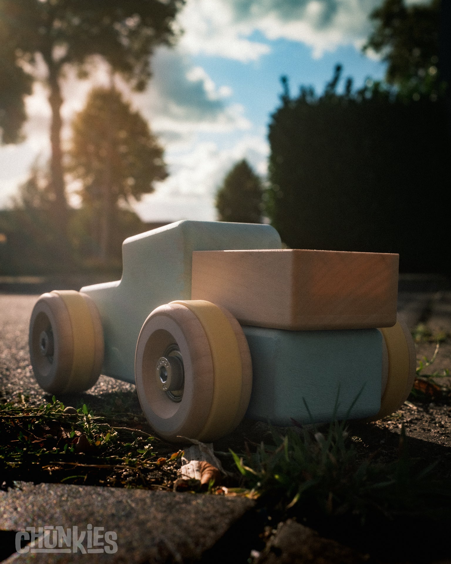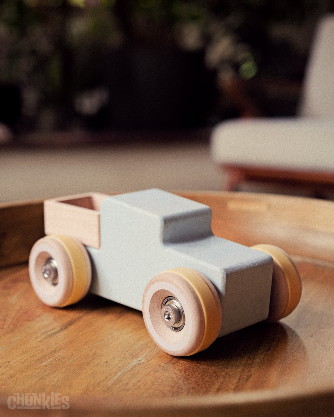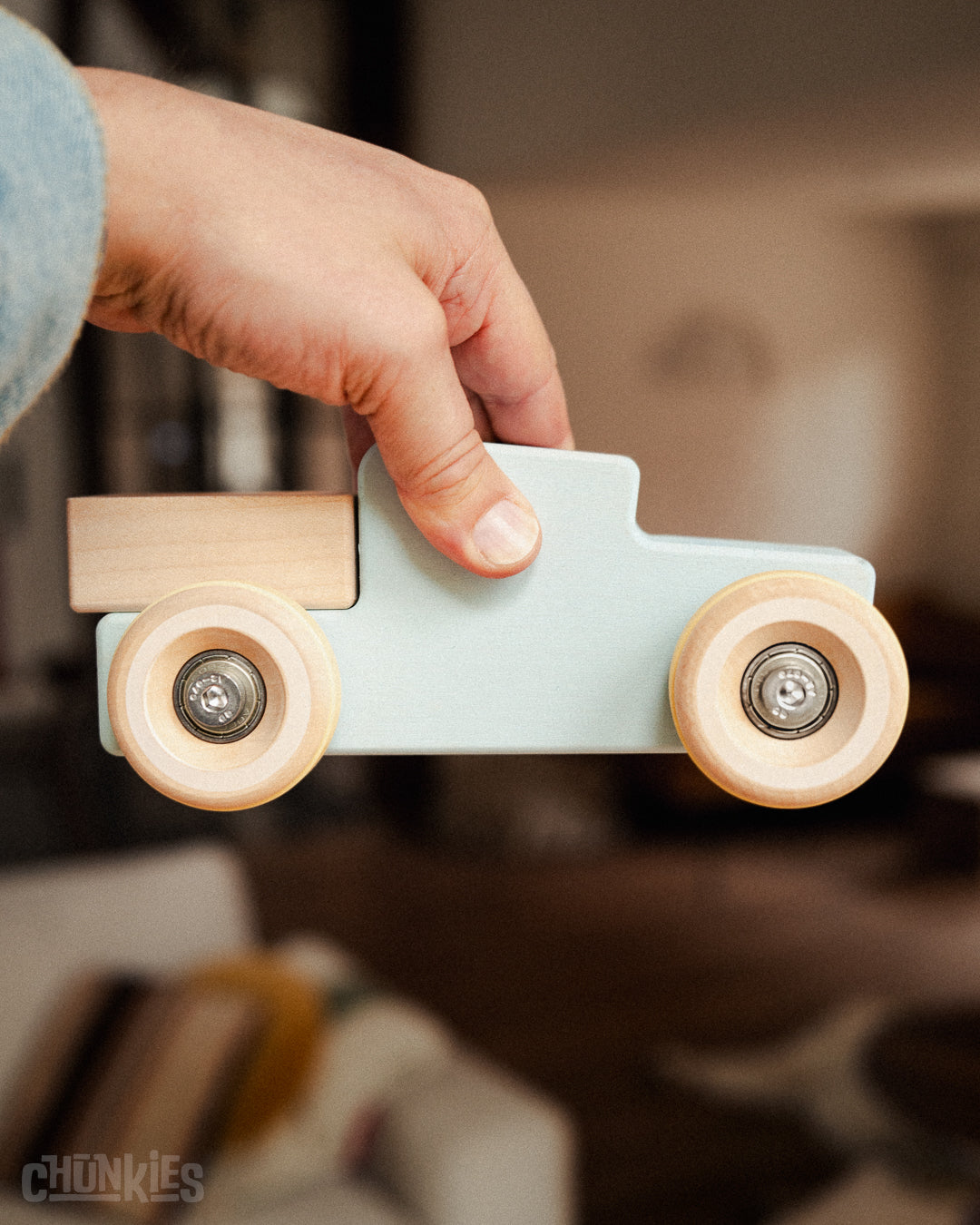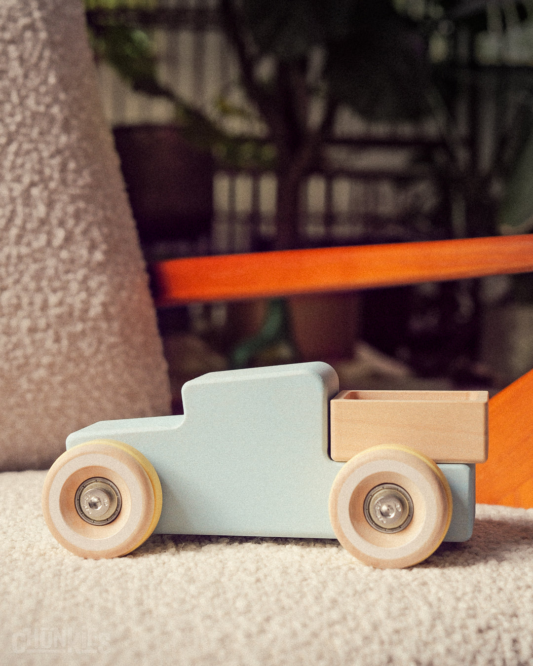 Chunkies are solid wooden toy cars with the silhouette of classic cars. They are built to last and designed to roll smoothly with real steel axles and skate bearings. Perfect for pushing, imaginative play, and collecting. There are no fixed rules – all forms of play are encouraged! Let your creativity lead the way and invent your own adventures.
