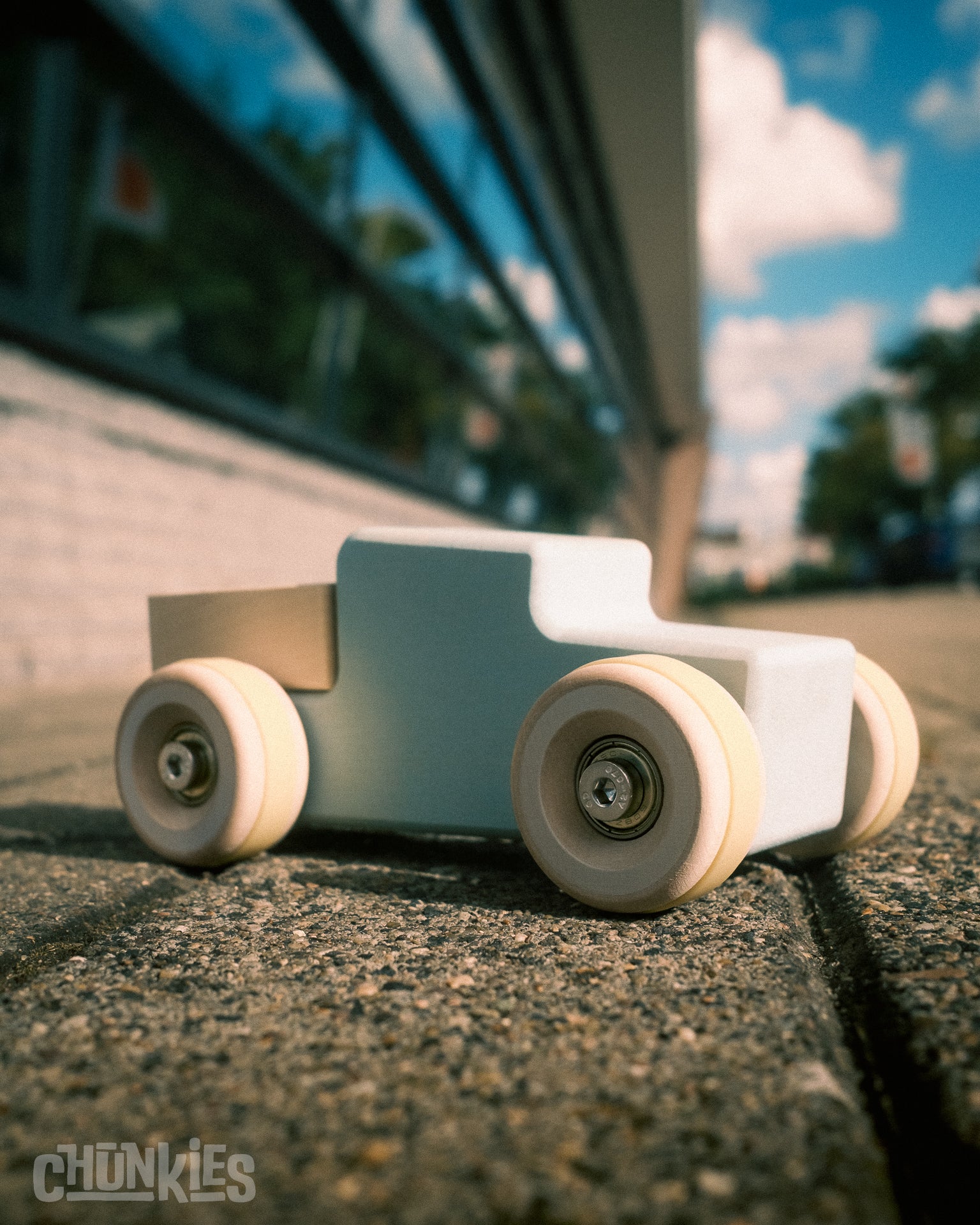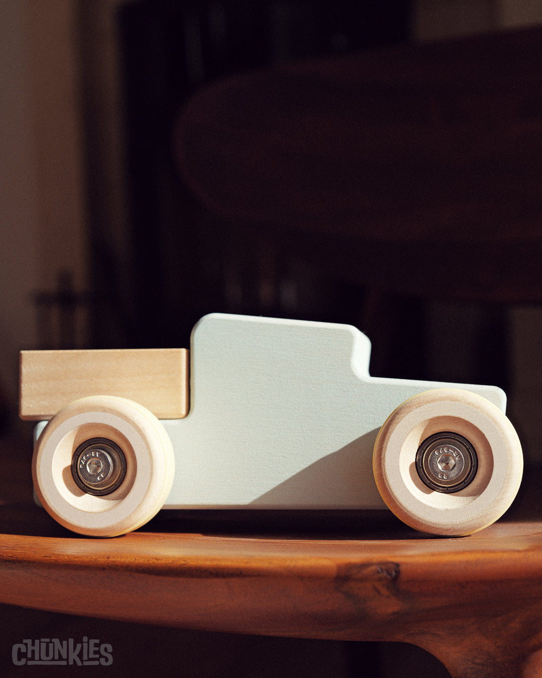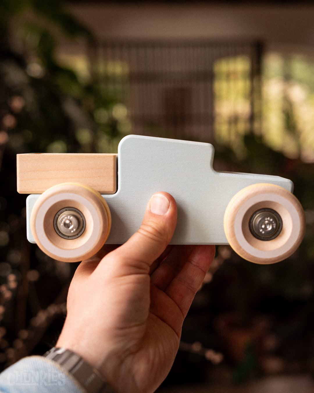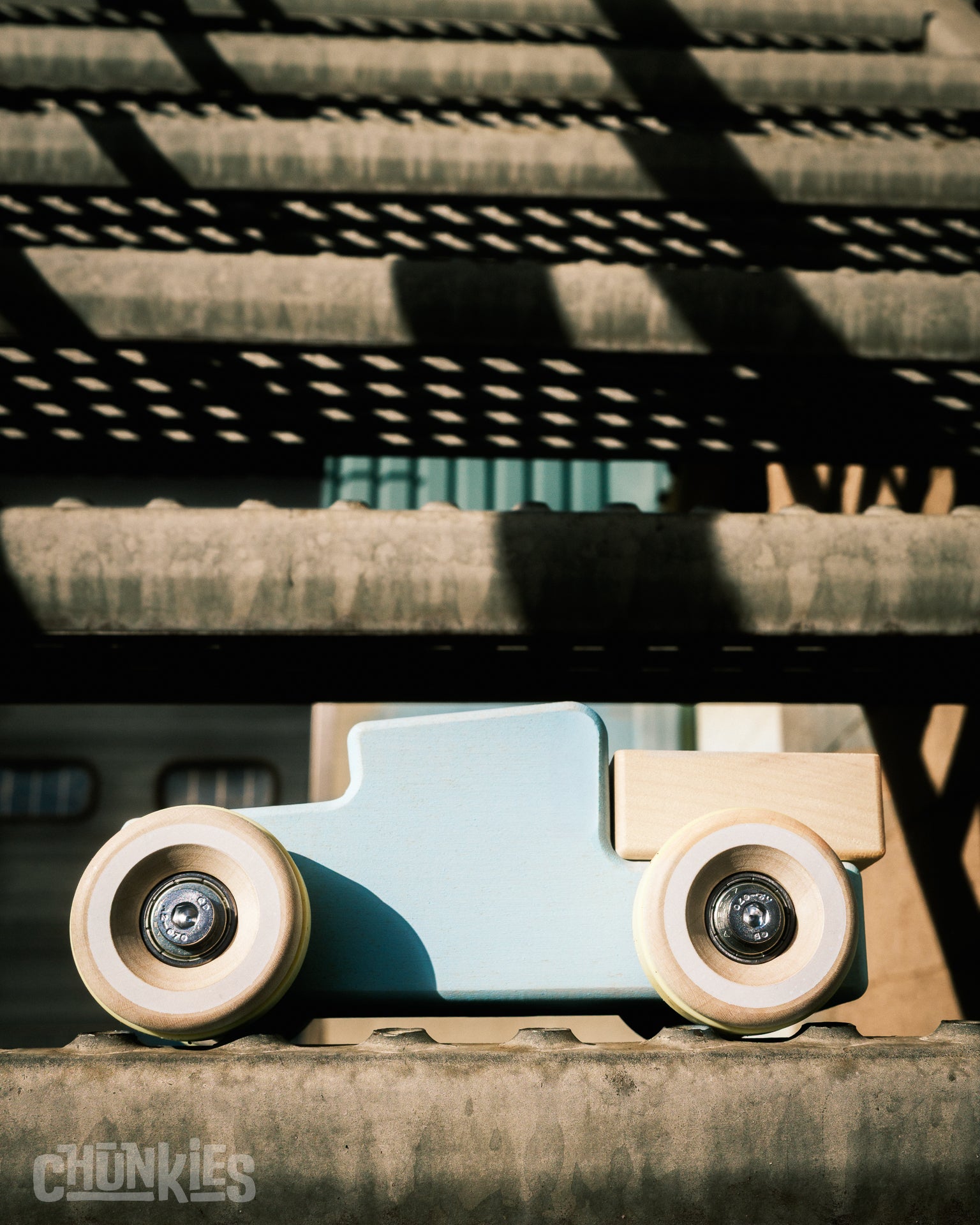 Chunkies are solid wooden toy cars with the silhouette of classic cars. They are built to last and designed to roll smoothly with real steel axles and skate bearings. Perfect for pushing, imaginative play, and collecting. There are no fixed rules – all forms of play are encouraged! Let your creativity lead the way and invent your own adventures.