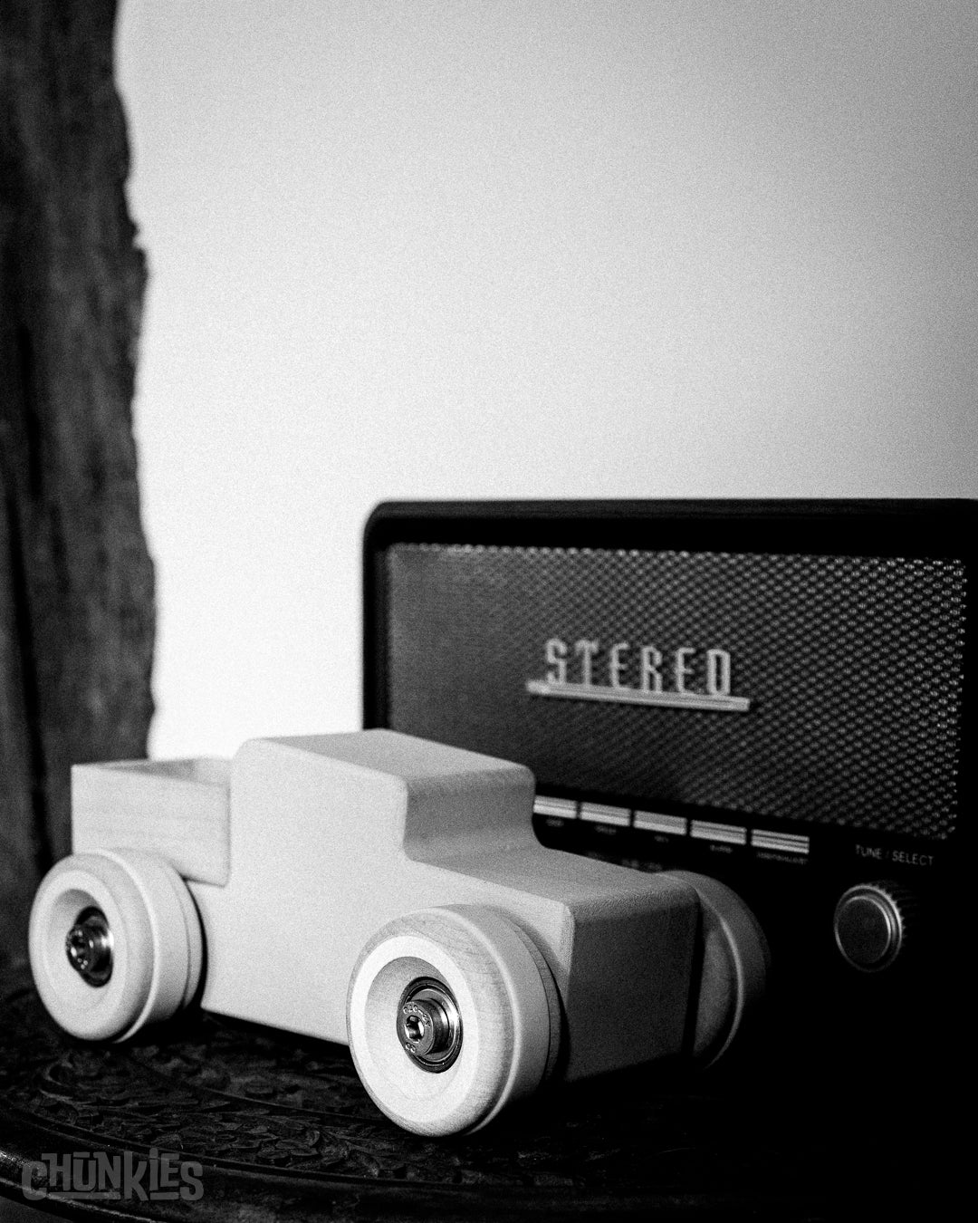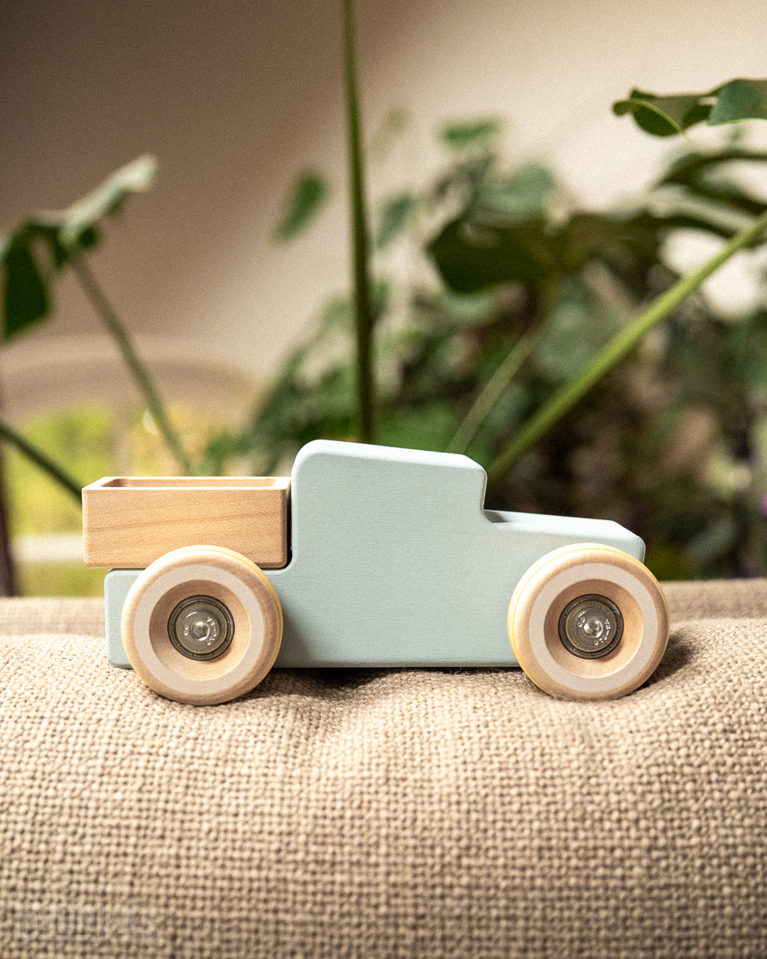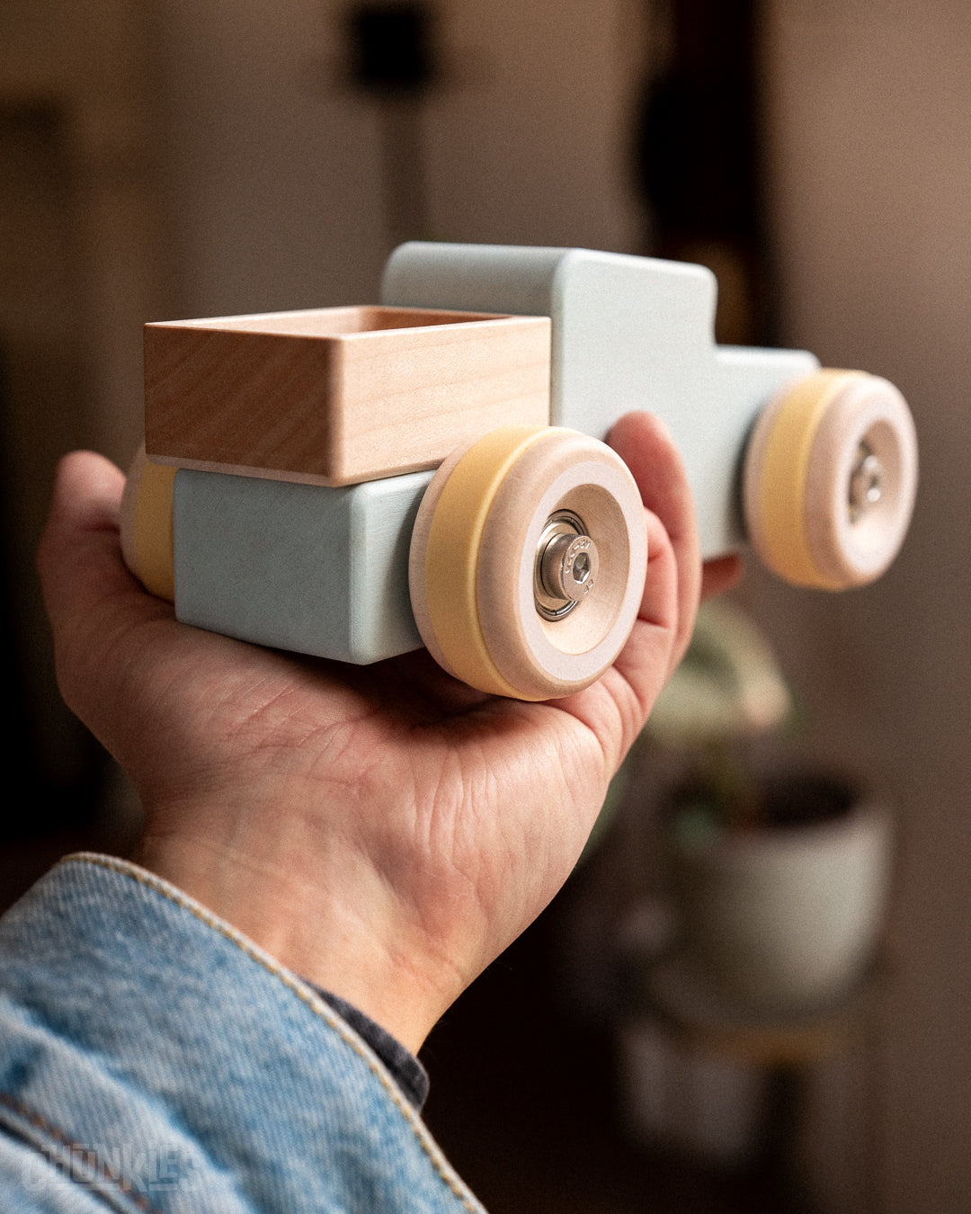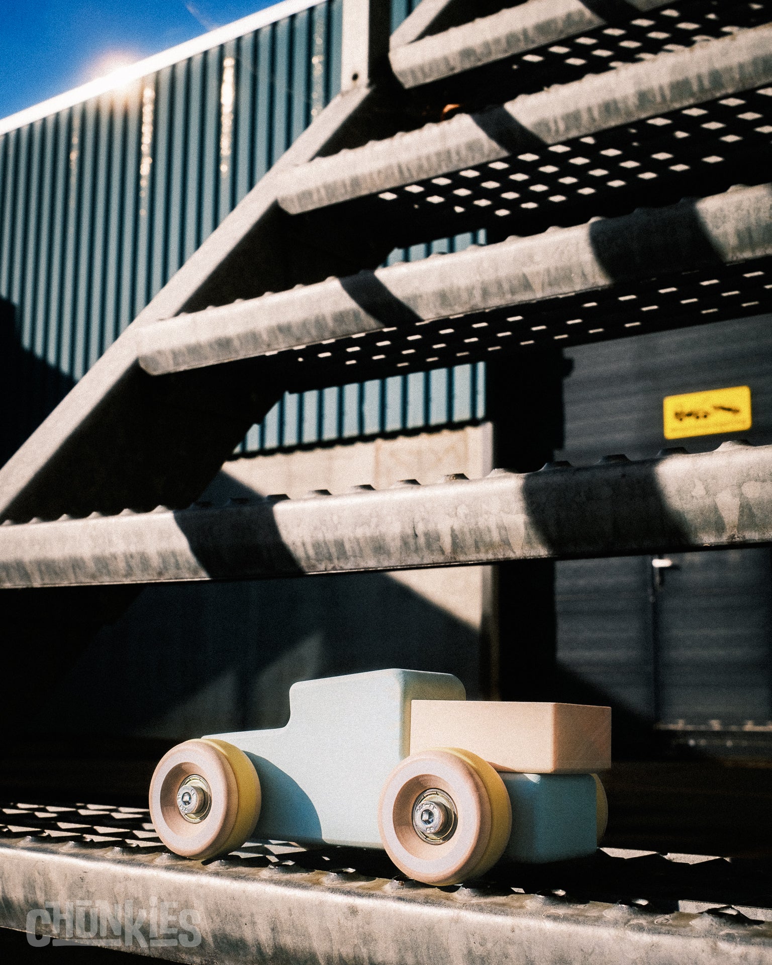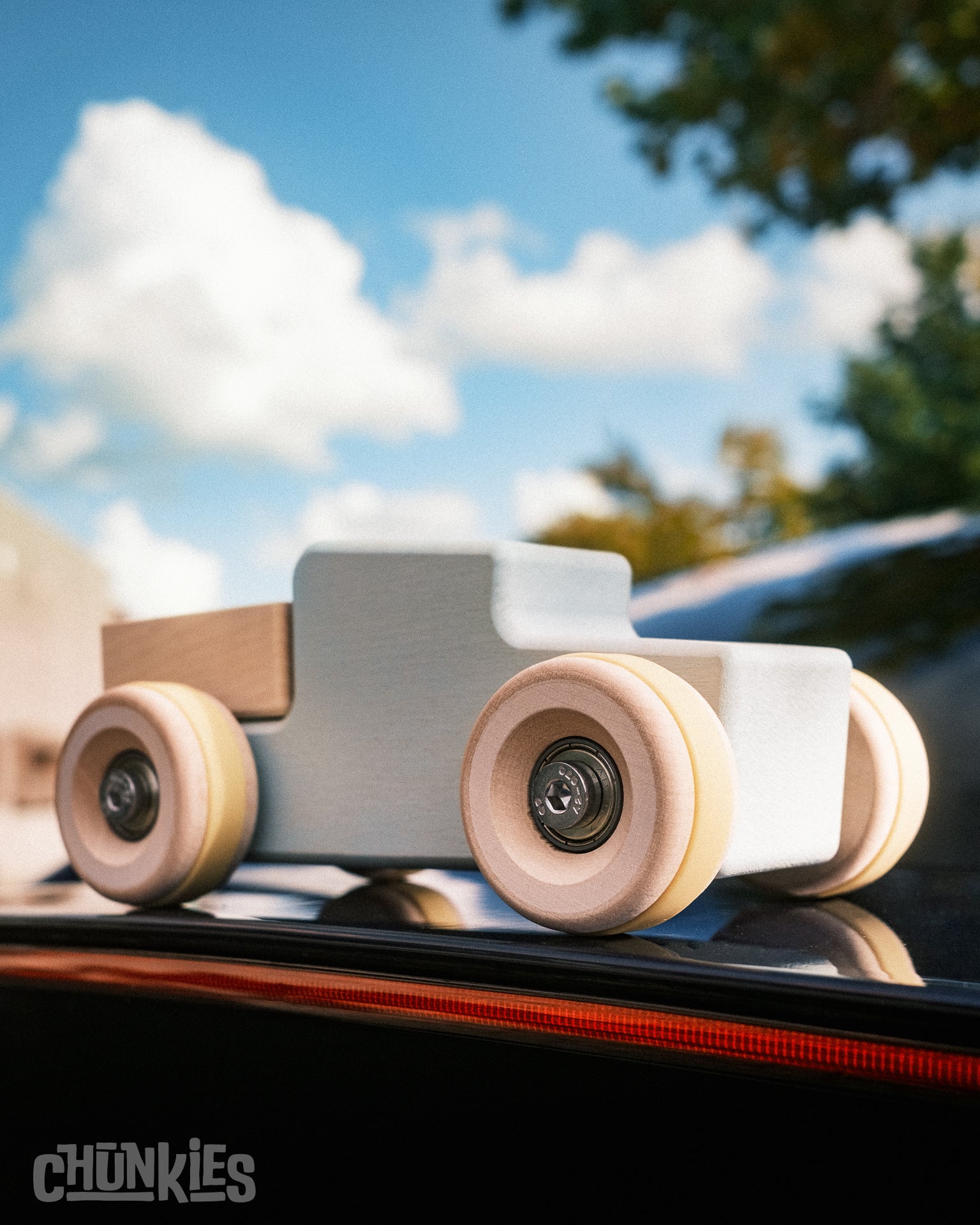 Chunkies are solid wooden toy cars with the silhouette of classic cars. They are built to last and designed to roll smoothly with real steel axles and skate bearings. Perfect for pushing, imaginative play, and collecting. There are no fixed rules – all forms of play are encouraged! Let your creativity lead the way and invent your own adventures.
