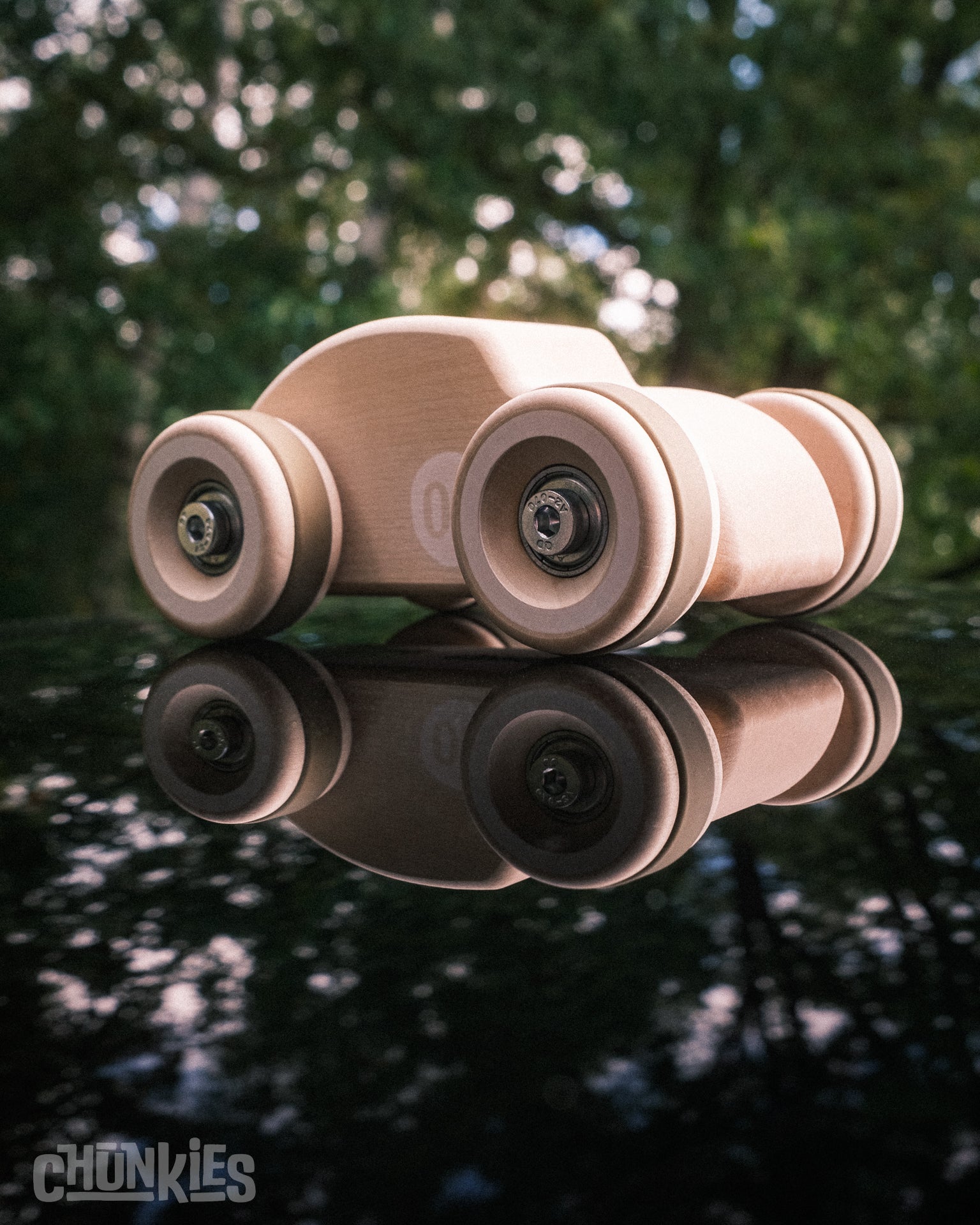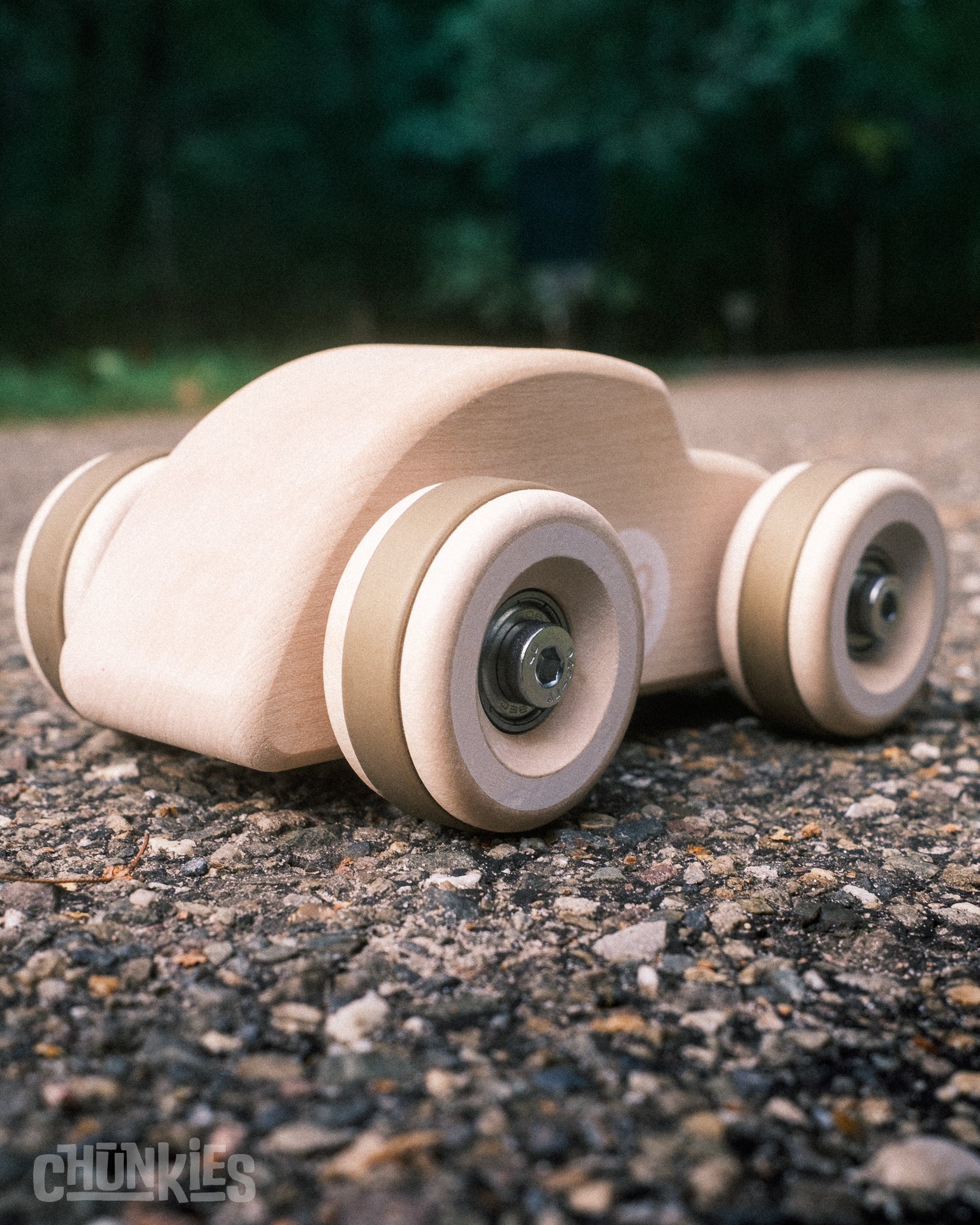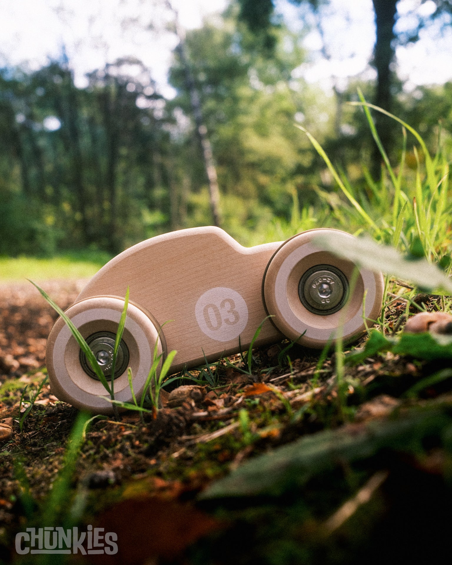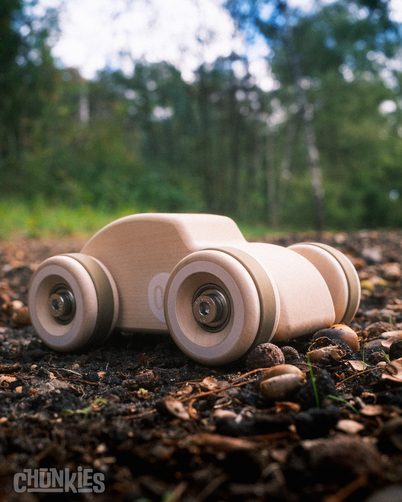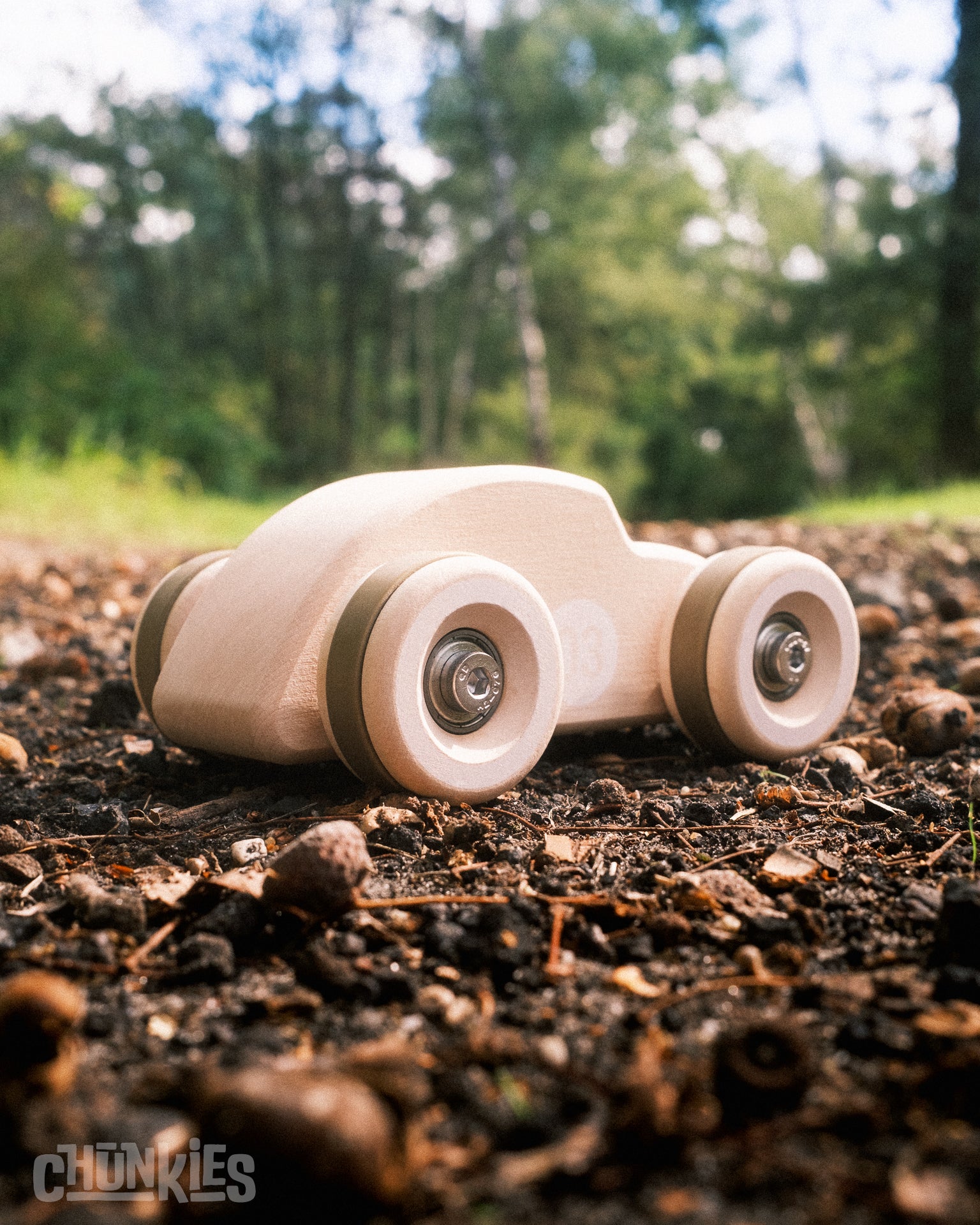 Chunkies are solid wooden toy cars with the silhouette of classic cars. They are built to last and designed to roll smoothly with real steel axles and skate bearings. Perfect for pushing, imaginative play, and collecting. There are no fixed rules – all forms of play are encouraged! Let your creativity lead the way and invent your own adventures.