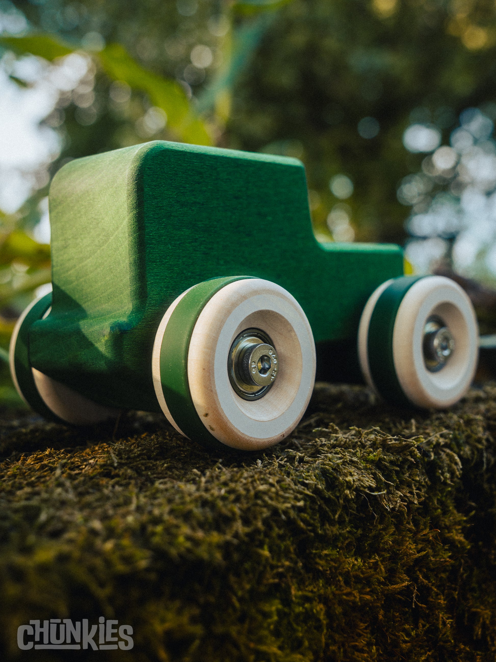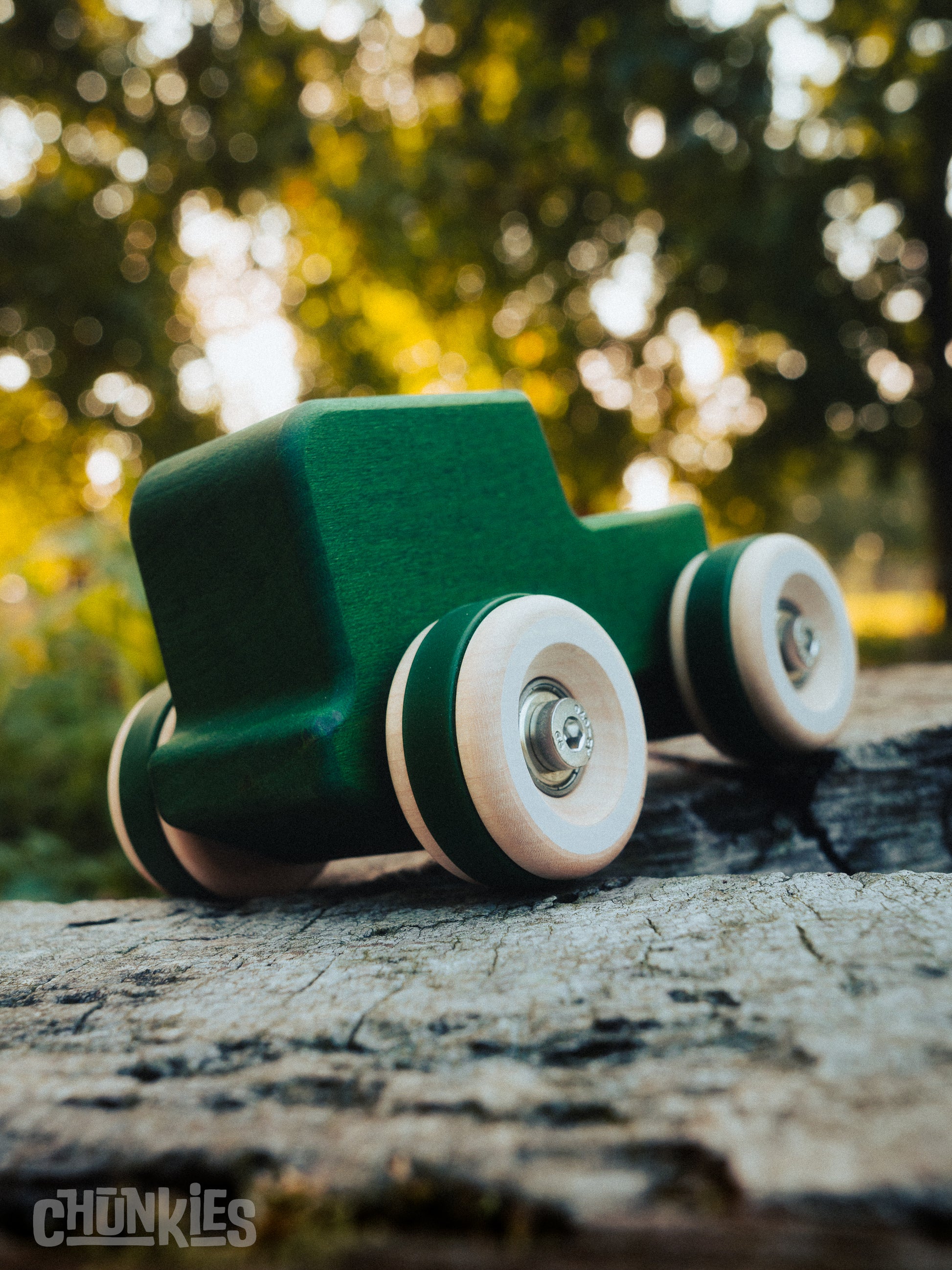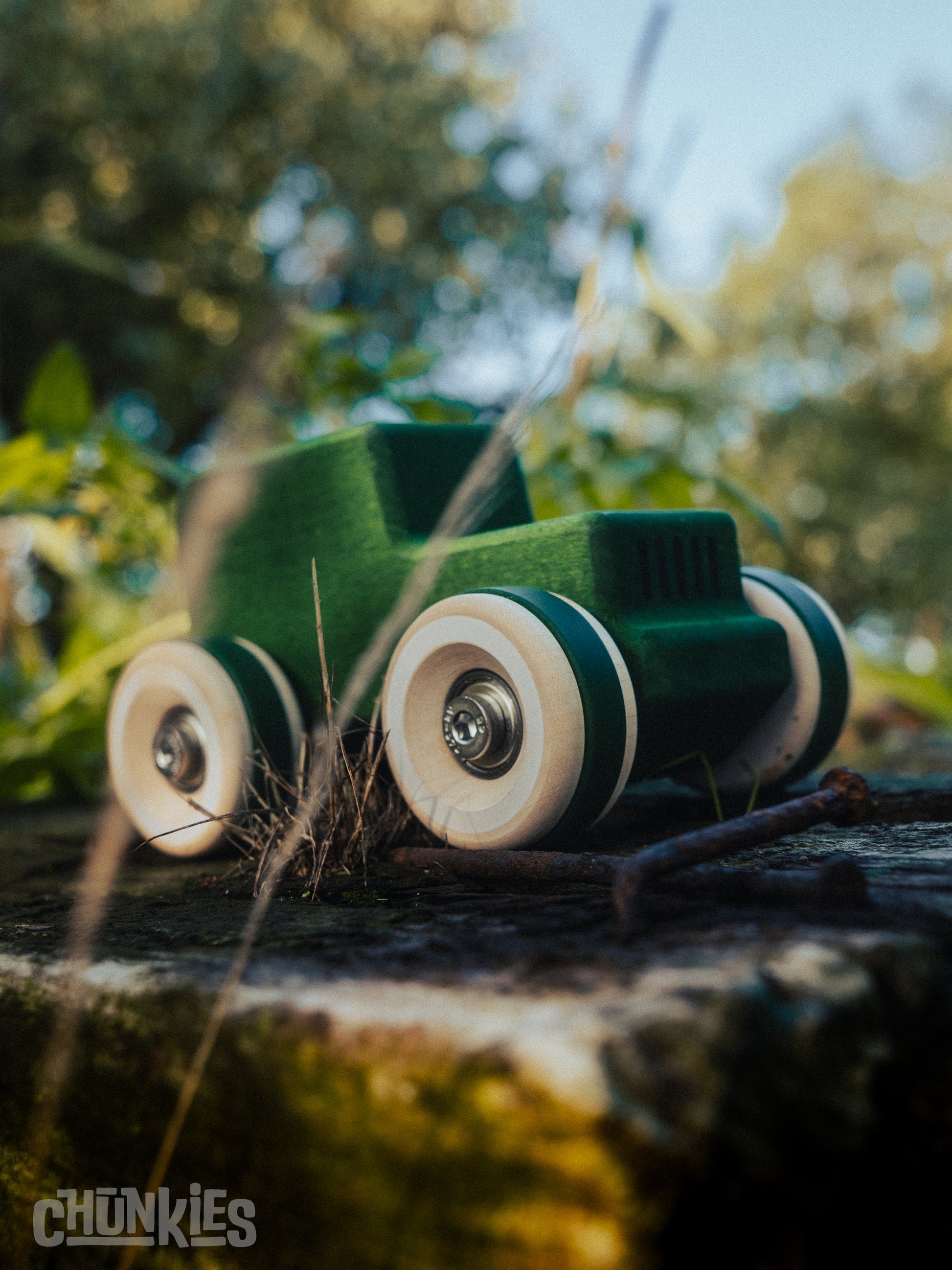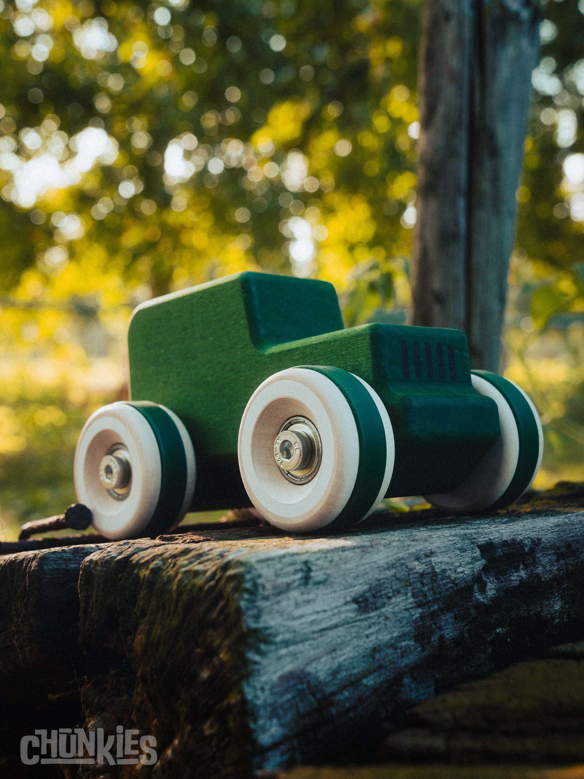 Chunkies are solid wooden toy cars with the silhouette of classic cars. They are built to last and designed to roll smoothly with real steel axles and skate bearings. Perfect for pushing, imaginative play, and collecting. There are no fixed rules – all forms of play are encouraged! Let your creativity lead the way and invent your own adventures.