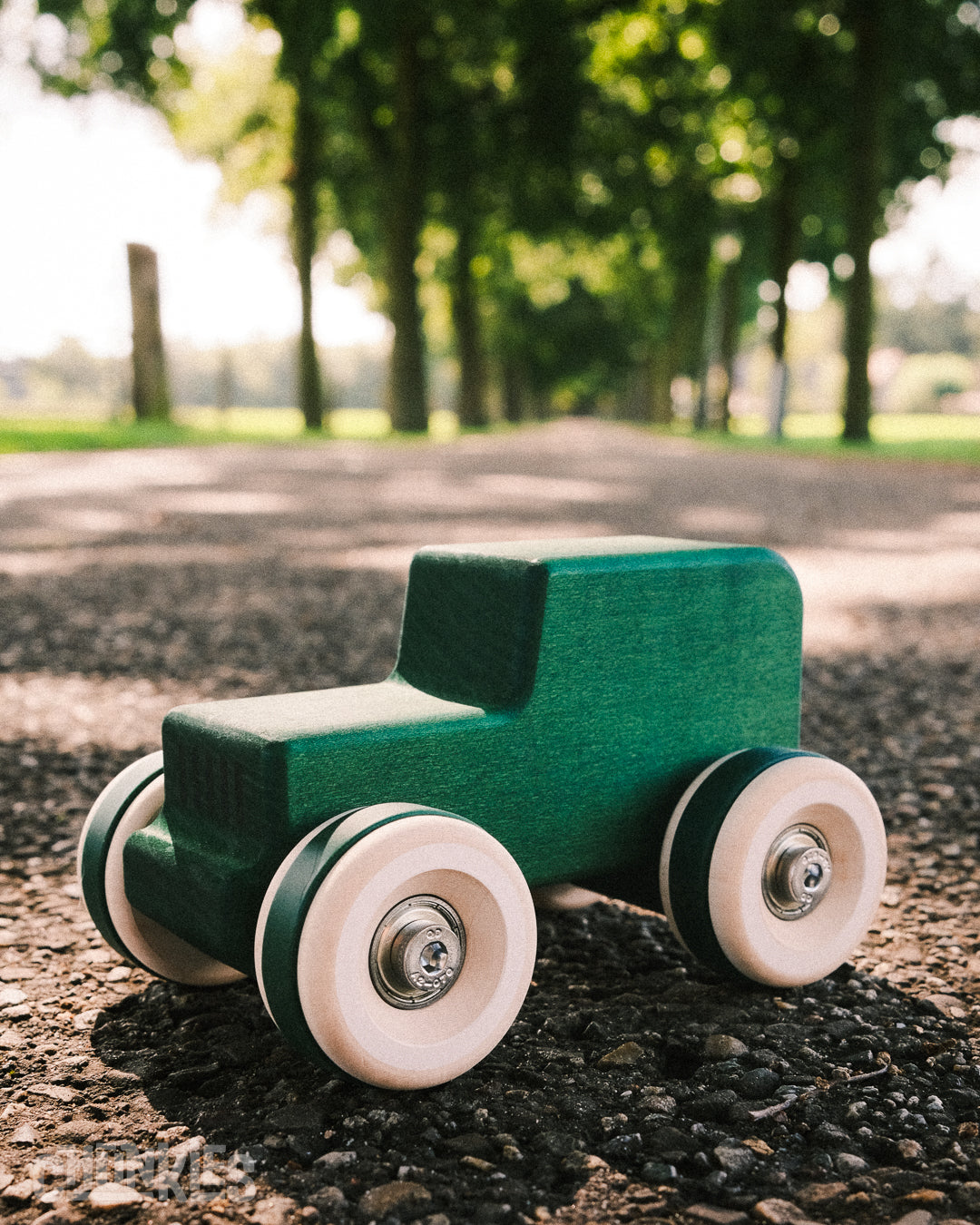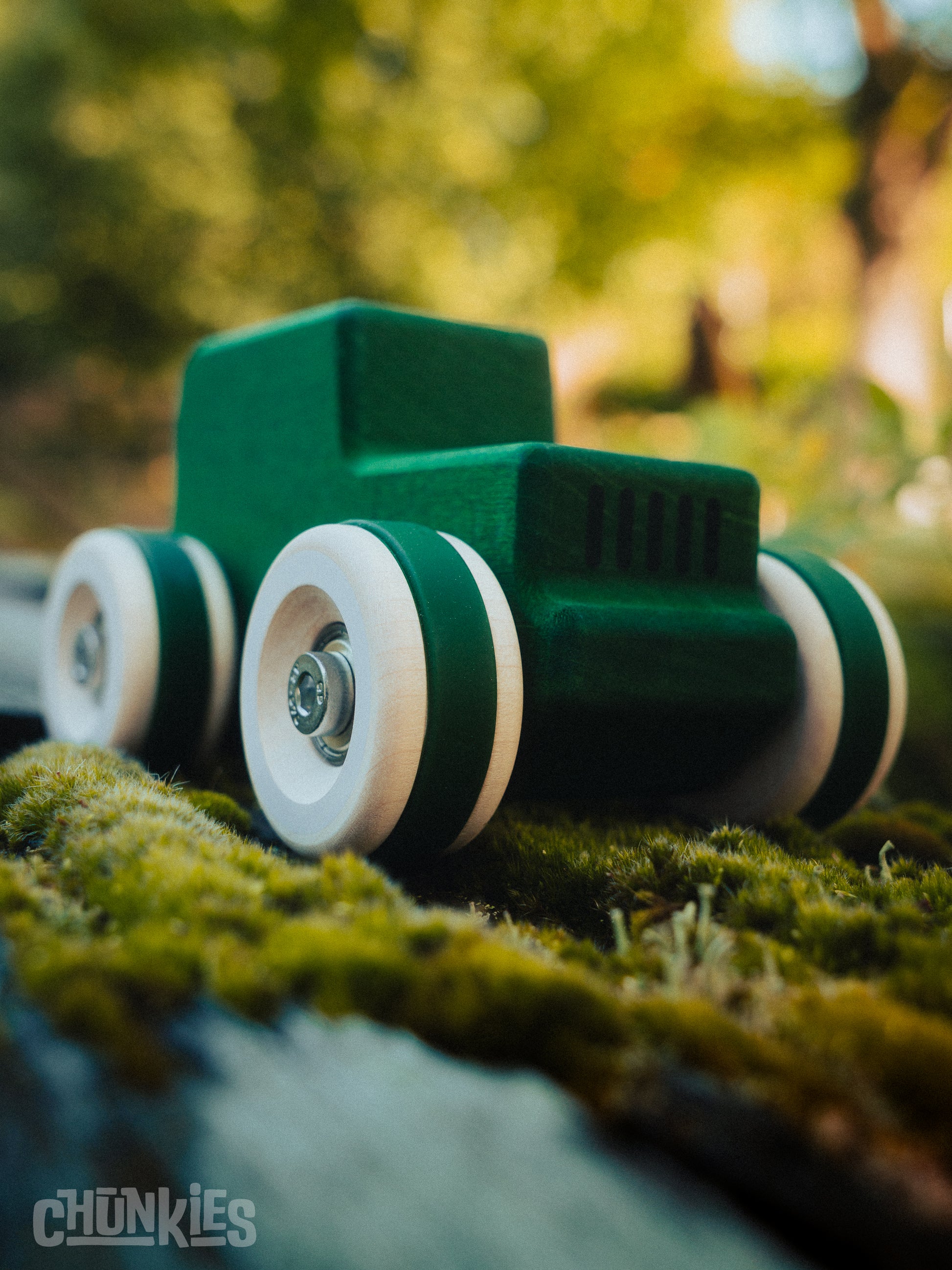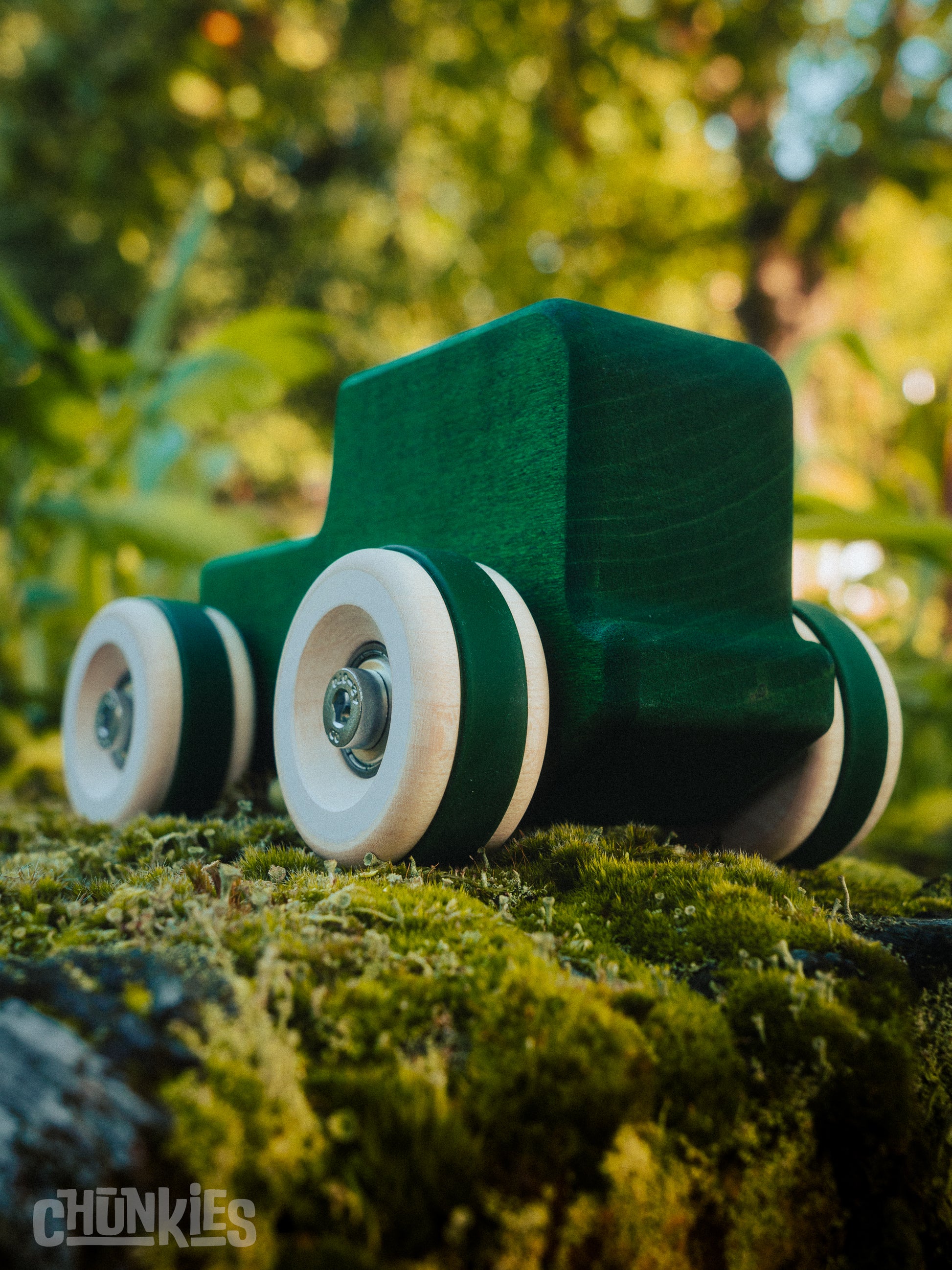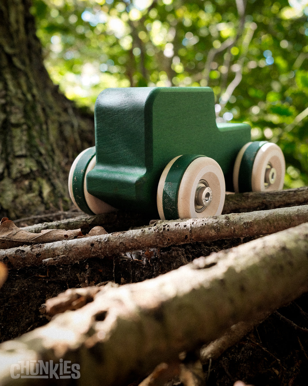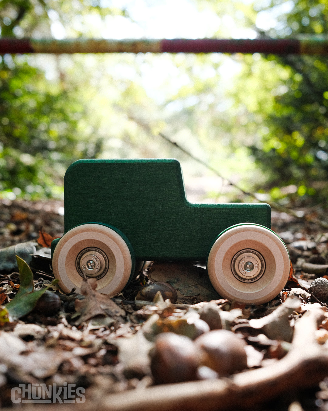 Chunkies are solid wooden toy cars with the silhouette of classic cars. They are built to last and designed to roll smoothly with real steel axles and skate bearings. Perfect for pushing, imaginative play, and collecting. There are no fixed rules – all forms of play are encouraged! Let your creativity lead the way and invent your own adventures.